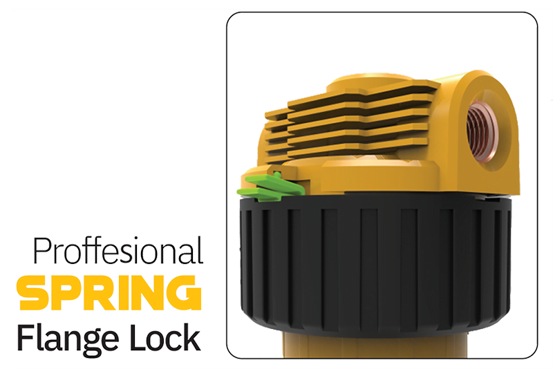 اولین ویژگی مهم این فیلتر فلنج قفل شونده در آن است که احتمال خطای نصاب را در جهت نصب صحیح به صفر می رساند بدین صورت که قفل فنری پلاستیکی موجود در قسمت پایه، در حفره روی فلنج قرار گرفته تا به اصطلاح فلنج قفل شود، این به منزله آب بندی کامل فیلتر می باشد.