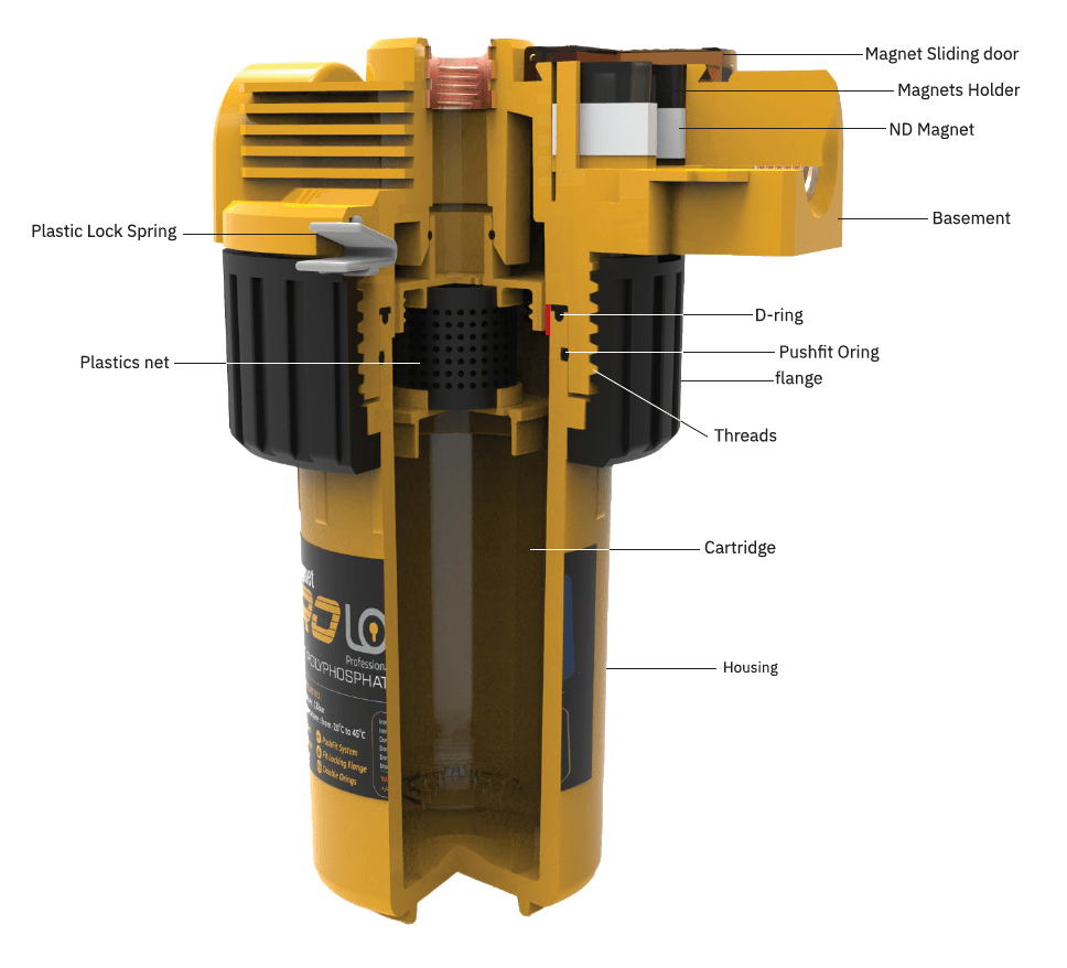 فیلتر پلی مگنت پرولاک، دارای دو مرحله حذف رسوب در مسیر آب عبوری به داخل سیستم است که در مرحله اول با ایجاد میدان مغناطیسی بسیار قوی به کمک مگنت هایی از جنس نئودیم و تبدیل بخش اعظمی از یونهای کلسیم و منیزیوم به پودر آراگونیت و در مرحله دوم عبور از میان کارتریج نمک سدیم هگزا متازون می باشد که به طور کامل حذف رسوب را انجام داده و دستگاه را از حیث وجود رسوب ایمن می دارد.